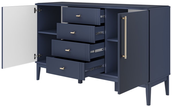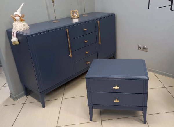Комод  Джали - это стильное и функциональное дополнение для вашего интерьера. Габаритные размеры комода составляют 148х89х44 см. Фасад и крышка выполнены из МДФ в цвете Тёмный лазурный, а корпус из ЛДСП в цвете Ночное небо, что придаёт комоду современный и элегантный вид. Комод оснащён направляющими шариковыми полного выдвижения, обеспечивающими лёгкий и плавный доступ к содержимому ящиков. Петли с доводчиками гарантируют бесшумное закрытие. Опоры из массива в цвете Тёмный лазурный добавляют устойчивость и изысканность конструкции.