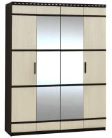 Четырехстворчатый шкаф разделен на два отделения. Одно отделение укомплектовано шестью полками для белья, второе - двумя стационарными полками (сверху и снизу) и штангой для одежды. Центральные фасады шкафа укомплектованы зеркалом.