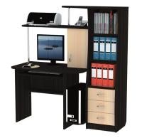 СК-28 – один из самых вместительных компьютерных столов. Именно поэтому данная модель достойно заняла свою ячейку лидеров продаж. Помимо привычной столешницы, выкатной полки для клавиатуры и ниши под системный блок, здесь предусмотрено большое количество шкафов, ящиков и полок. Всё это вмещает пенал в правой части стола: 3 удобных выдвижных ящика и 3 вместительные открытые ниши для хранения папок и бумаг. Крыша пенала не только образует дополнительную полку, но и стильно подчеркивает дизайн изделия, плавно переходя в надстройку. Она закрытый шкаф, место для монитора и полку сверху.  Также полка для всего необходимого есть и под столешницей.